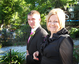 The lawn had large white columns leading the bridal party to the ceremonial site. More columns flanked the back of the area. Ferns draped from the pedistals and melded with nature and the ages old trees. It was an impressive site.