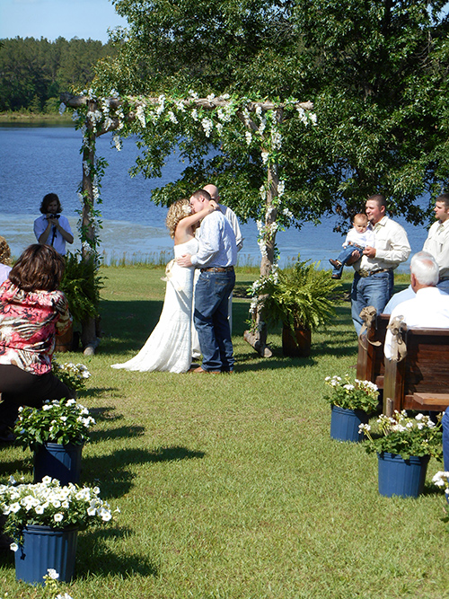 When the day of the wedding arrives, the weather forecast becomes very important. Rain was predicted and it did rain during the night before the wedding. However the day of the wedding could not have been better. The sun was shining down on Cochino and the new couple's wedding. A huge crowd gathered from Lufkin, Pollock and surrounding areas to witness the ceremony. A wedding theme of wild flowers prevailed. There were fresh flowers and plants everywhere. The bride and her mom had repurposed all the containers which were decorated and painted and held the plants which then were given to the guests to take home. The bride's cake table had a cake plateau made of wood by the Groom's dad. It was 3 layers holding the bride's cake on top and layered with cup cakes. The groom's cake table was the 'hunter of hunters' table. It had deer, antlers, greenery and things associated with the forest and hunting. This was the art work of Jerri Crawford, aunt of the Groom. Three large barrels in the mid deck held arrangements of more wild flowers which blended well with all the decor. The Grandfather performed the ceremony for the new couple. Connie Wells coordinated the wedding making sure that everything was on time, in place, and moving forward. Connie takes the stress out of a wedding and manages everything from getting the attendants down the aisle to the buffet table being ready and in order. She has been to Cochino many times and is truly welcomed by everyone.